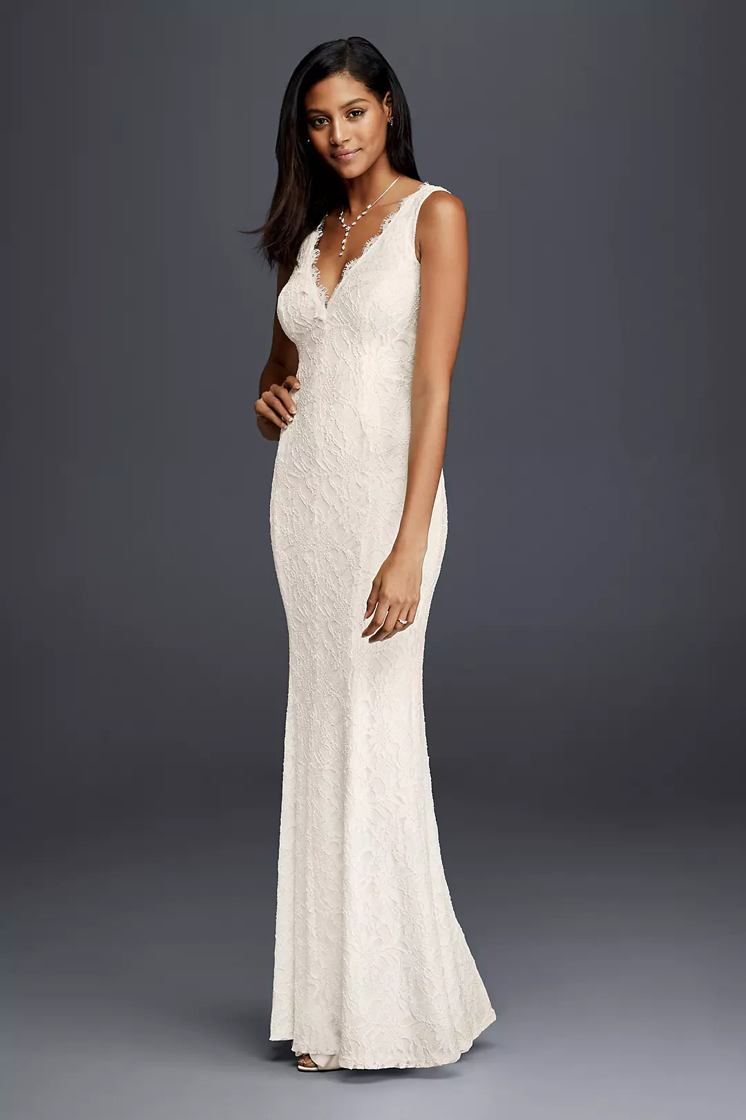 Wearing a classic sheath lace wedding dress means you can accessorize to make the look your own. Complement this sleeveless, V-neck gown with jewels and a sparkling headpiece for a completely custom look. Infused with stretch for a comfortably curve-hugging fit.