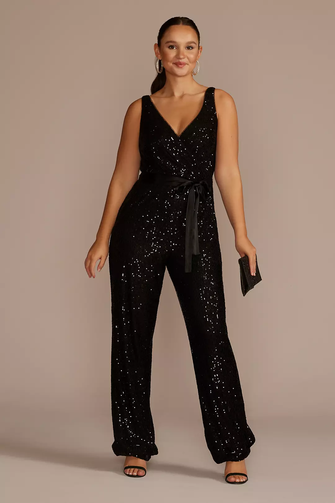 This stunning Allover Sequin V-Neck Tank Jumpsuit from David's Bridal is the perfect choice for a glamorous and chic look. The V-neckline adds a touch of sophistication, while the all-over sequin detailing ensures you'll sparkle and shine all night long. Whether you're attending a wedding, prom, or any special event, this jumpsuit is sure to turn heads and make you feel like a star. Pair it with some strappy heels and statement earrings for a complete and show-stopping outfit. Get ready to dazzle in this fabulous occasion wear from David's Bridal!
