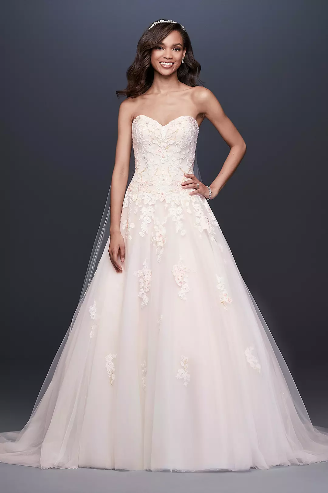 Beaded floral lace appliques bloom in the faintest shade of pink on this romantic ball gown wedding dress, while golden embroidered branches and a voluminous tulle skirt add to the fairytale feel. Finished with a lace-up corset back for a perfect fit.