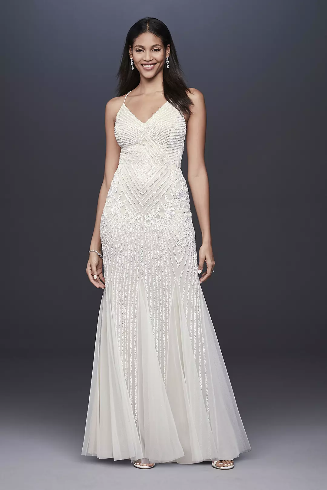 Adorned from V-neckline to hem in intricate beadwork, this stunning sheath dress features crisscross straps and godets.