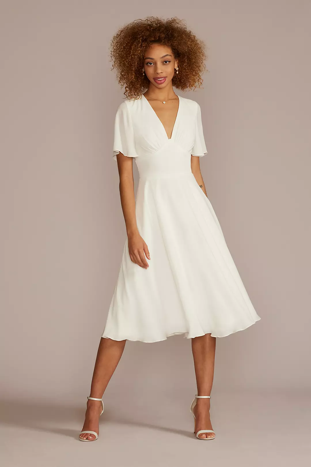 The chiffon flutter sleeves, empire waist, and open keyhole back make this midi-length dress timeless. Make it modern with a sparkly heel or keep it classic with a blusher veil and understated jewelry.