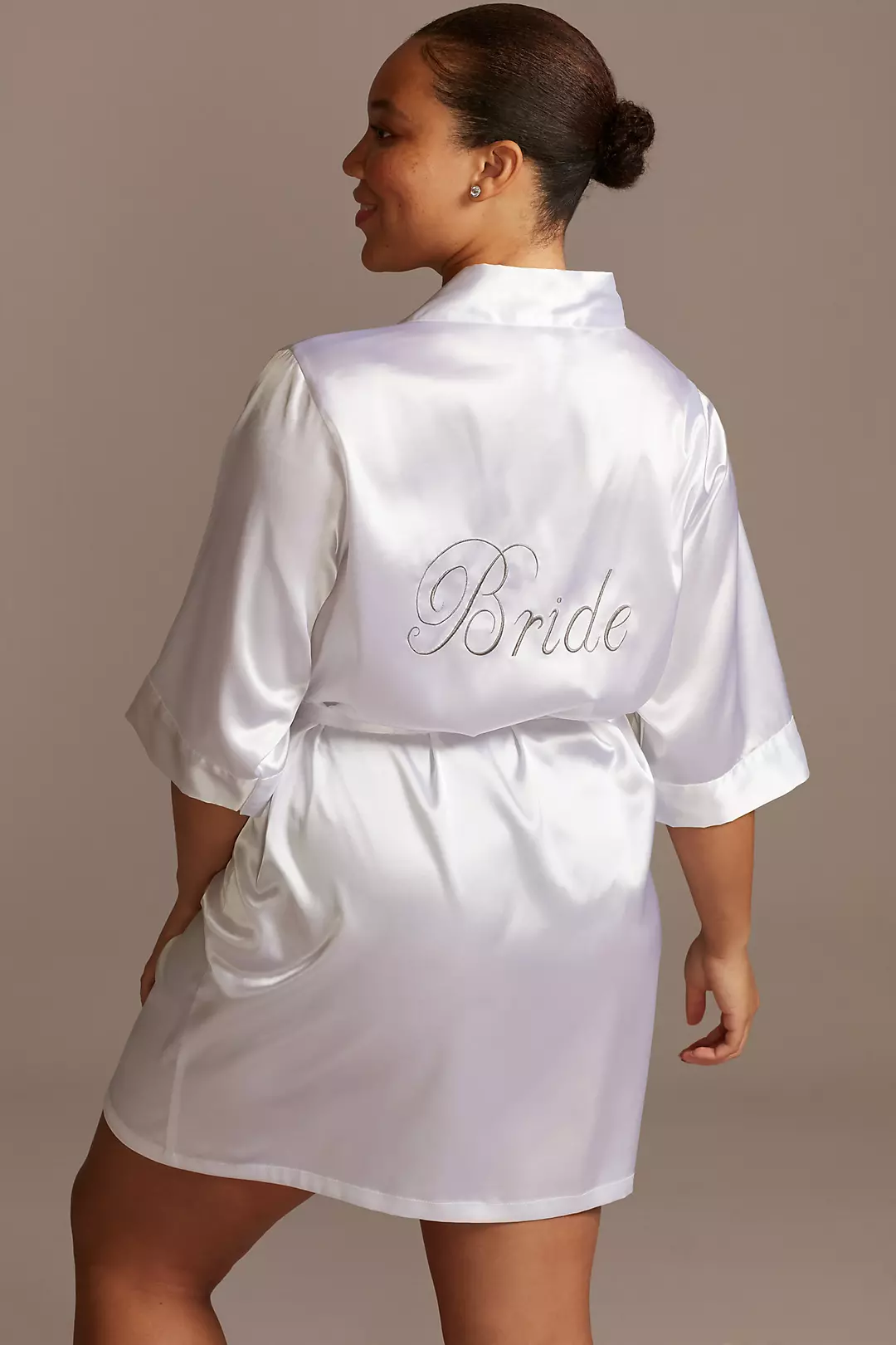 This elegant robe is perfect for the bride to wear while getting ready on her wedding day. The soft satin material feels luxurious against the skin, and the delicate embroidery adds a special touch. The robe features a comfortable fit and a tie waist for a flattering silhouette. Whether you're sipping champagne with your bridesmaids or having your hair and makeup done, this robe will make you feel like a queen. It's a beautiful keepsake that you can cherish long after the wedding day is over. Get ready to say \"I do\" in style with this stunning embroidered satin bride robe from David's Bridal.