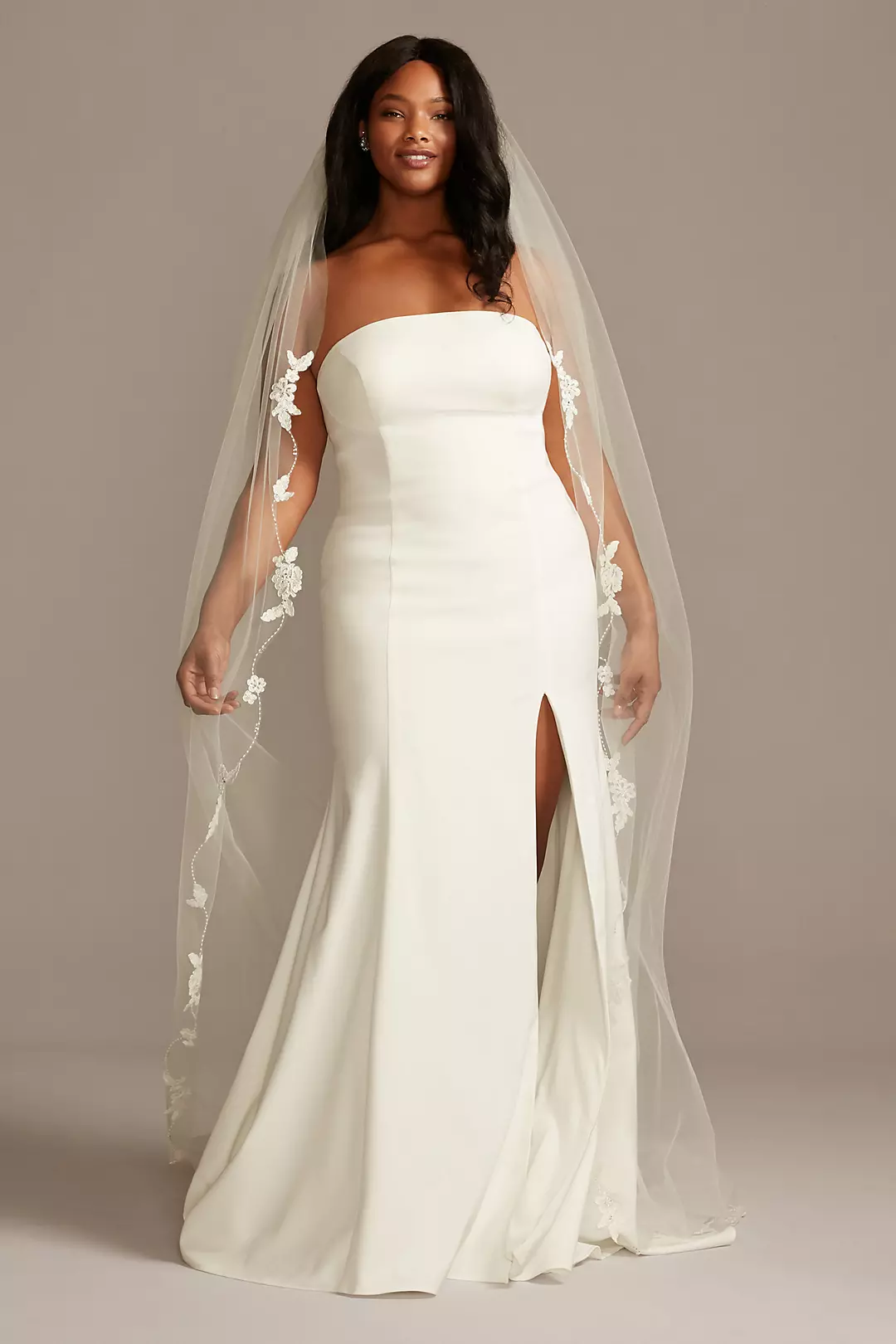 Embroidered floral appliques and delicate beading trailalong the edge of this cathedral-length veil, forming a sweet scalloped pattern.