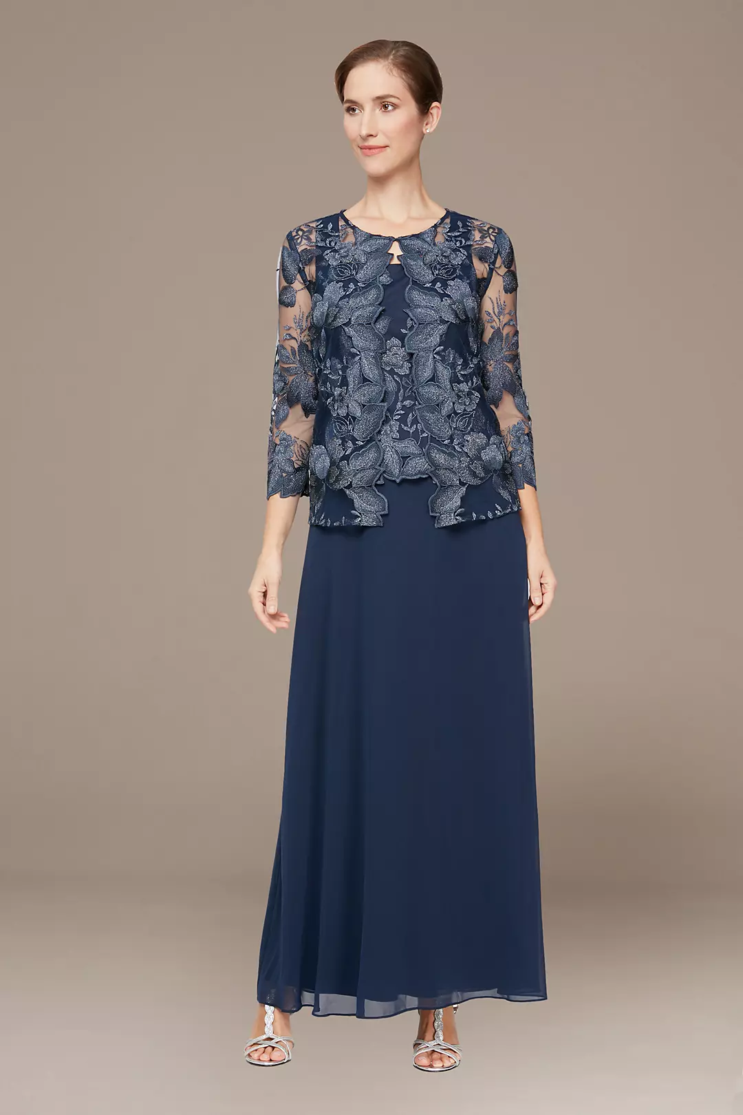 Make an elegant statement in this two-piece set, featuring a dress with an embroidered sleeveless bodice and chiffon skirt, and a matching lace illusion open jacket.