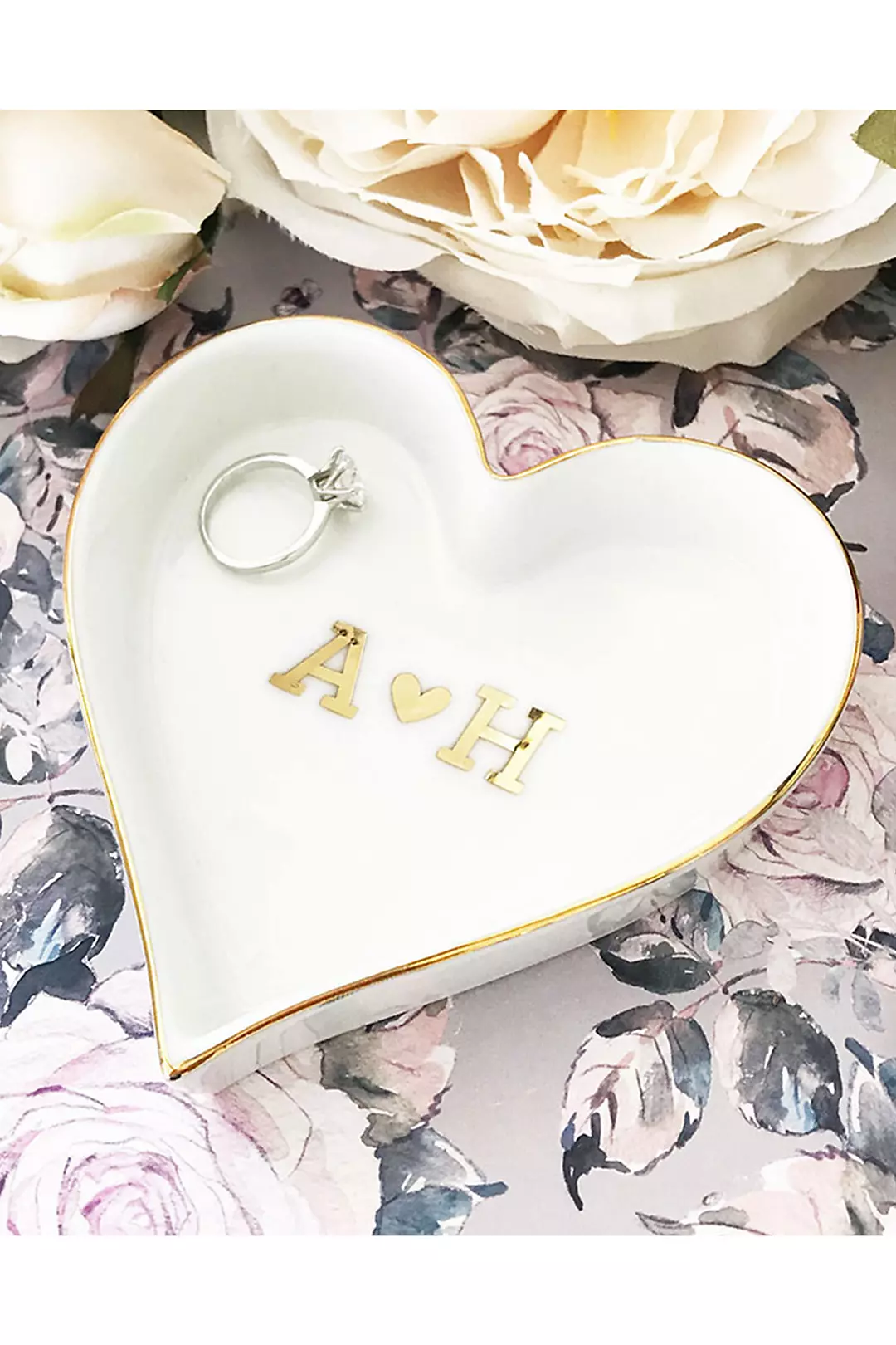 Couple monogram heart shaped ring dishes make stylish and practical gifts for newlyweds and anniversaries! Each white dish has a metallic gold trim and is personalized with the couples initials and a heart in metallic gold vinyl.