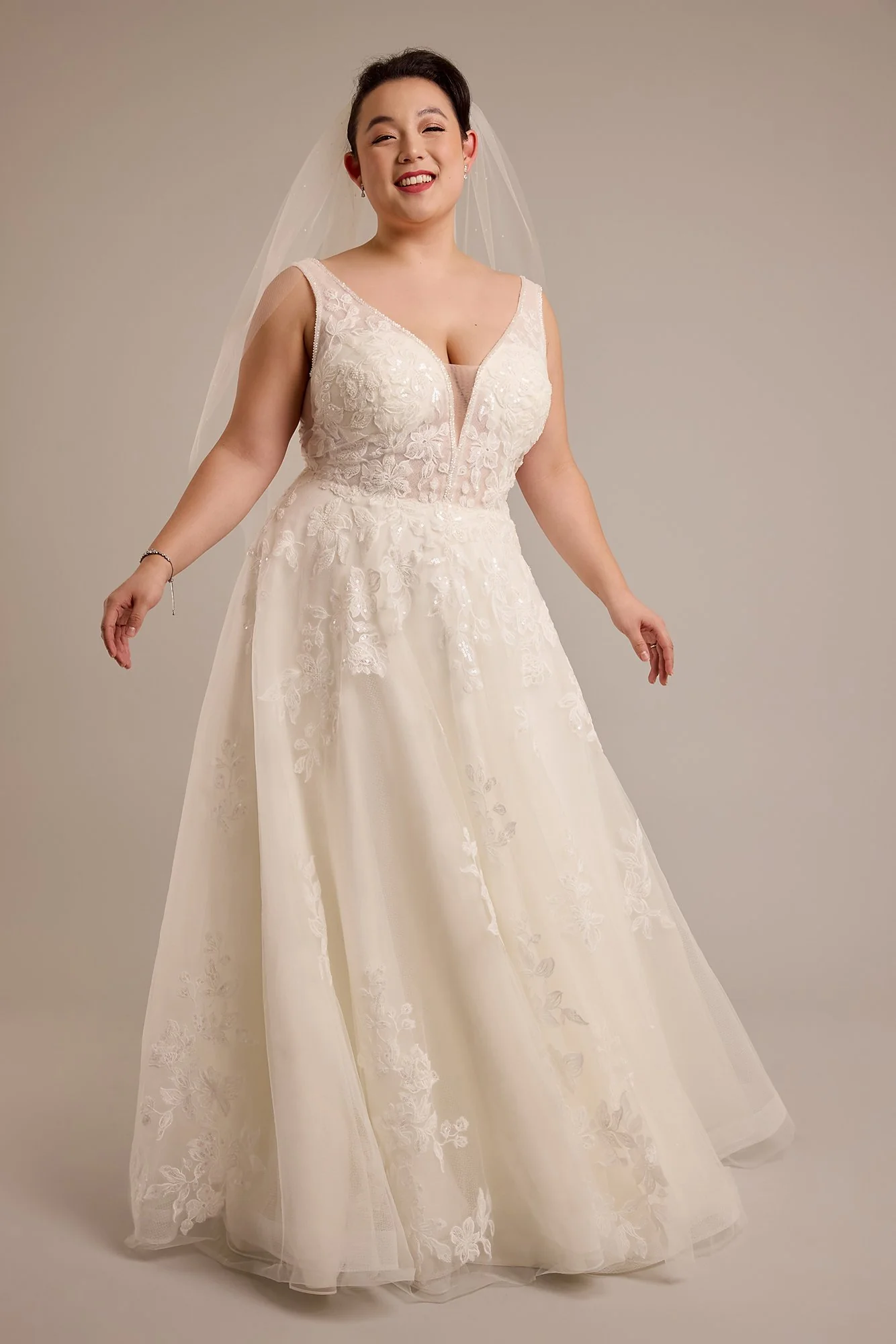 As sexy as it is graceful, this tulle wedding dress pairs a plunging neckline and V-shaped side panels with a ball gown silhouette and lace appliques. Interior boning ensures the intricate beading won't weigh you down.