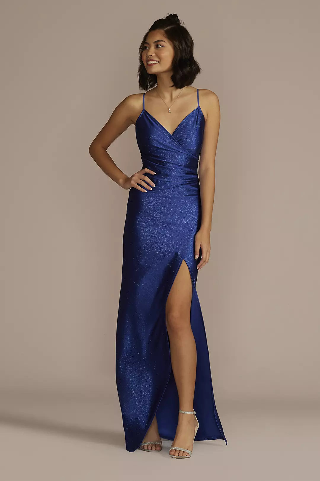 Stretch fabric turns this glitter knit dress into any dancing queen's must-have. The perfectly draped bodice and thigh slit add beauty to the wrap-style silhouette, making a great choice for prom or any black tie affair.